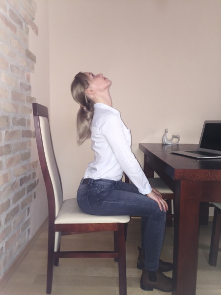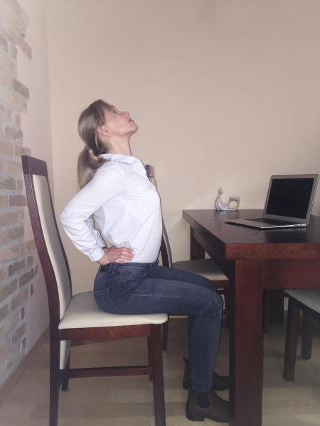 Usiądź na krześle i wyprostuj się. Połóż dłonie na krzyżach. Na wdechu delikatnie naciśnij dłońmi na plecy i zrotuj ramiona na zewnątrz. Unieś klatkę piersiową do góry i odchyl głowę do tyłu.