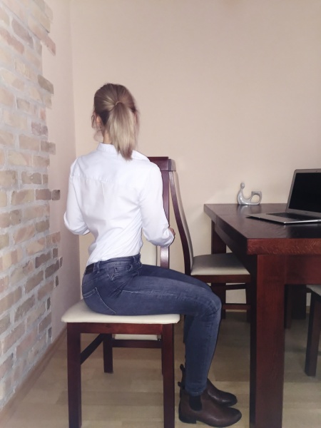 Przyjmując tę pozycję, znajdujesz się w dokładnie odwrotnej pozycji do tej, którą zazwyczaj przyjmujesz pracując przy komputerze czy telefonie. Weź głęboki wdech i napełnij całe płuca powietrzem.