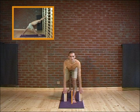 - I z wydechem zachowując wyprostowane nogi dokręcone biodra wyciągnij się w przód i oprzyj dłonie na klockach.