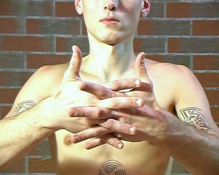- Siedząc w svastikasanie spleć palce dłoni, wyciągnij ręce do przodu.