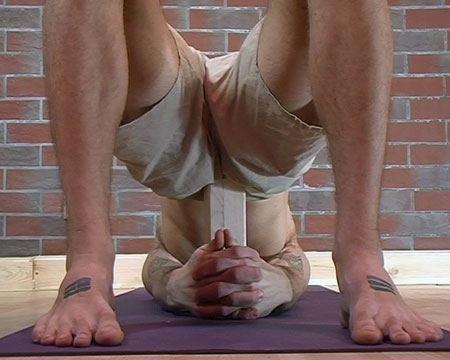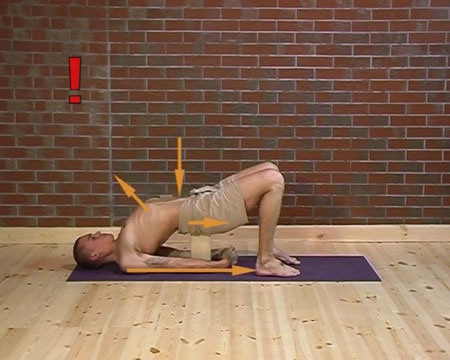 - Na wydechu unieś biodra do góry i włóż drewnianą kostkę pod kość krzyżową.