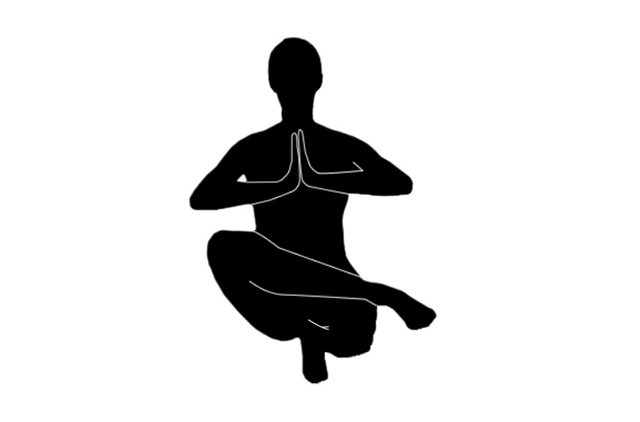1. Stań w Tadasanie (pozycji góry). Zegnij lewą nogę, podnieś do góry lewą piętę a następnie oprzyj ją na szczycie prawego uda. Także nieznacznie zegnij nogę na której stoisz.