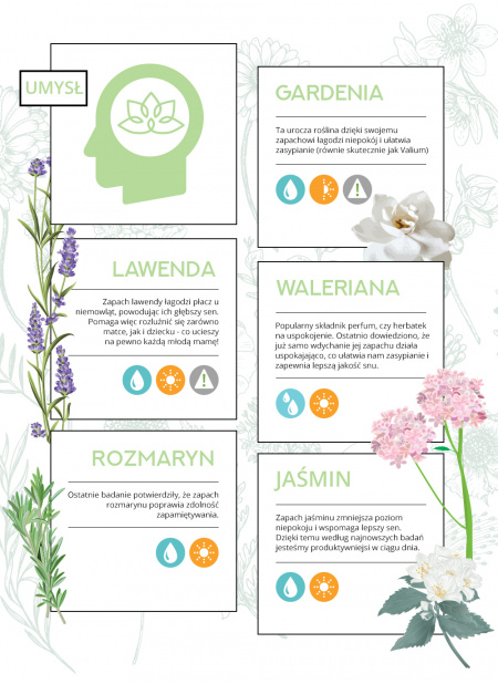 Poprzez powonienie oddziaływują na nas także jaśmin i gardenia. Jaśmin pomaga łagodzić niepokój i bezsenność, gardenia zaś pozytywnie wpływa na skupienie i produktywność. Kolejną rośliną o supermocach jest waleriana, którą już od czasów starożytnych stosowano pod postacią herbatek, czy nalewek na bezsenność. Niedawno naukowcy odkryli natomiast, że już sam zapach waleriany może mieć pozytywne działanie na jakość naszego snu.