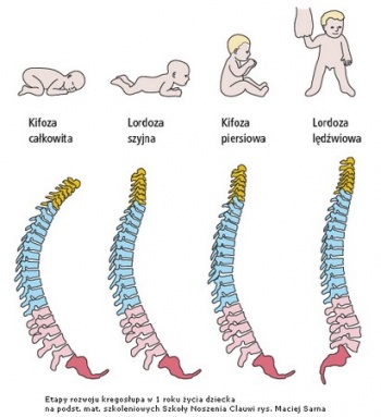 W ontogenezie postać wczesna człowieka ma jedną dużą krzywiznę - zwinięcie w kłębek. Ślady zwinięcia pozostają na całe życie w postaci zaokrąglenia potylicy (tylnej części czaszki), górnych pleców (kifoza piersiowa), pośladków (kifoza krzyżowa) oraz pięt. Rozwijanie odbywa się poprzez wytwarzanie krzywizn wtórnych, kompensujących te zaokrąglenia. Kiedy leżąc na brzuszku zaczynamy zerkać za mamą unosząc ciężką głowę, tworzy się lordoza szyjna. Kiedy zaczynamy stopniowo gruntować swoją pozycję na dwóch nogach, powstaje lordoza lędźwiowa. Do około piątego miesiąca życia kręgosłup w tym odcinku jest wygięty do tyłu, około 13-tego miesiąca prostuje się, a w wieku 3 lat zaczyna tworzyć się wygięcie do przodu. Z czasem poprzez pracę mięśni nóg wytwarzają się łuki stóp, także jako krzywizna wtórna.