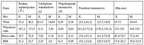 Tabela 1: Parametry antropometryczne ćwiczących hatha-jogę (K - kobiety, M - mężczyźni)