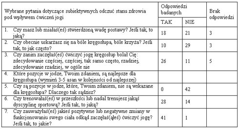 Udzielono następujących odpowiedzi: 15 osób odpowiedziało, że zanim zaczęły ćwiczyć jogę kręgosłup bolał je zdecydowanie częściej, 8 osób - częściej, 2 osoby - tak samo często, 1 osoba - rzadziej, nikt nie odpowiedział, że zdecydowanie rzadziej. Można zatem wnioskować, że ten system ćwiczeń poprzez uaktywnienie i wzmocnienie mięśni wokół kręgosłupa, a także zwiększenie ruchomości kręgosłupa poprawia jego sprawność i zmniejsza, a nawet likwiduje dolegliwości bólowe. Interesujące odpowiedzi udzielili uczestnicy ankiety na temat rodzaju pozycji hatha-jogi (asan), których wykonanie szczególnie dobrze wpływa na kręgosłup. Z 42 osób nie wypowiedziała się tylko jedna osoba. Była też jedna odpowiedź wskazująca na wszystkie ćwiczenia jogi, jako prawidłowo oddziaływujące na kręgosłup.