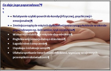 Relatywnie szybko odczujemy, że joga ułatwia nam powrót do kondycji fizycznej i psychicznej. Zmniejsza napięcie mięśni i dyskomfort, który odczuwamy w okresie porodowym: na przykład ból ramion, szyi czy pleców. Wzmacnia i stabilizuje mięśnie. Spokojne chwile relaksu łagodzą zmęczenie, stres i wyciszają umysł oraz pozwalają pogłębić wieź z nowo narodzonym dzieckiem.
