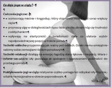• Ćwiczenia jogiczne wzmacniając kręgosłup, wpływają na elastycznosć i świadomosć ciała, co później ułatwia wybór najodpowiedniejszych pozycji porodowych.