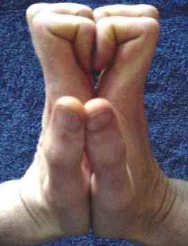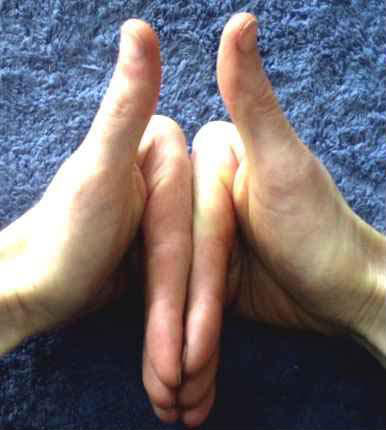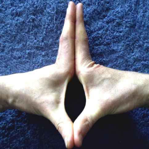 Zęby smoka. Dociśnijcie nasady dłoni ściśle do siebie. Oddalcie od siebie trzecie stawy palców. Starajcie się, aby paliczki środkowych palców były równoległe względem siebie.
