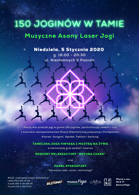 5 stycznia 2020, wypełniamy 400 m2 Poznańskiej Tamy aż 150 Joginami, którzy doświadczą niespotykanego dotąd wymiaru praktyki Jogi. MuscoYoga (Music Communication Yoga) wraz ze swoim Tanecznym Vinyasowym Flow przy akompaniamencie specjalnie skomponowanej Deep Orientalowej muzyki łączy siły z oprawą laserową Lumen Art w rezultacie tworząc unikalny mikro-świat, w którym Jogini będą mogli wgłębić się w ich praktykę i intencje na początek roku.