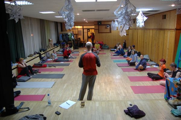 Z kolei tematem niedzielnych warsztatów były trzy bandhy, nad którymi praca była przemyślanym rozwinięciem sobotniego seminarium. Jednym ze znaczeń słowa bandha jest łączyć razem. Bandhy są więc dalszą pracą mającą na celu pogłębienie i połączenie oddechu z ruchem. Ich stosowanie skutkuję większą kontrolą nad ciałem oraz bardziej stabilną i bezwysiłkową praktyką. Z energetycznego punktu widzenia bandhy zapobiegają rozproszeniu energii i kierują ją we właściwe miejsca. Maciek szczegółowo omówił trzy bandhy: jalandhara bandhe, uddiyana bandhę i mula bandhę.