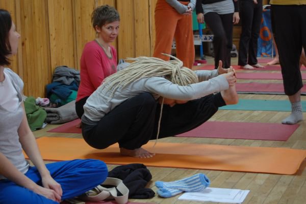 Zaczęliśmy od sekwencji wprowadzającej i tataka mudry, które przygotowały nas do dalszych asan. Jathara parivartasana (z wariantem zgięcia w bok, nie skrętu) i kilka wersji pavanmuktasany i apanasany przygotowały nasze ciało do sekwencji wygięć do tyłu. Poznaliśmy wiele trudniejszych wersji prostej pozycji jaką jest dvi pada pitham (znana też niektórym jako ćatuśpadasana). To zadziwiające jak skutkuje niewielka zmiana ustawienia w tej asanie. Płynna seria asan poprowadziła nas do mocniejszych wygięć do tyłu. Sethubandhasana, urdhva dhanurasana z wariantami i ćakrasana pokazały jak trudną sztuką jest zapanowanie nad oddechem, zaś liczne warianty urdhva prasarita padahastasany i supta padangustasany uświadomiły jak ważna jest synchronizacja ruchu z oddechem. Następnie wyciszyła nas joganidrasana. Sekwencję zakończył rozbudowany cykl wariantów sarvangasany i halasany. W całej praktyce praca dynamiczna i statyczna świetnie się uzupełniały dając poczucie równowagi i harmonii. Na koniec seminarium poznaliśmy różne rodzaje pranajamy i wzorców oddechowych, a także poznaliśmy potencjały poszczególnych partii oddechu.