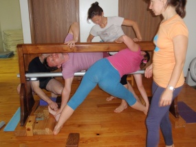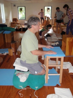 Po grupie terapeutycznej, mamy chwile przerwy i o godz. 9.00 zaczynamy ponownie. Tym razem praktyka jest prowadzona przez Lois, skłony do przodu, boczne oraz skręty w pozycjach stojących i siedzących. Otrzymujemy dużo informacji gdzie i jak terapeutycznie stosować powyższe asany.