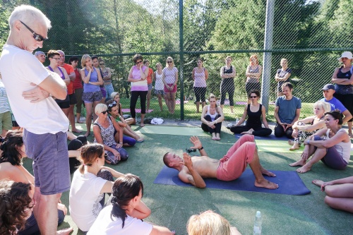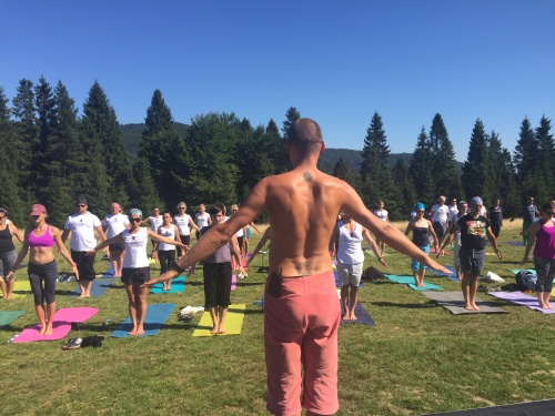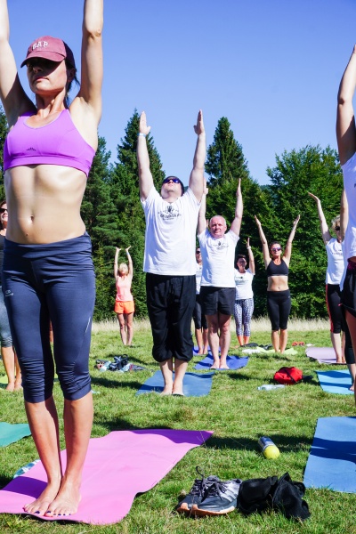 Po rejestracji i zapisach nie było na co czekać - czas na praktykę.W warsztatach prowadzonych przez Radka Rychlika i Wiktora Morgulca wzięło udział ok. 120 osób. Warsztaty z jogi funkcjonalnej i jogi w formule RUCH - ODDECH - RELAKS były doskonałym przedsmakiem do 108 Powitań Słońca na szczycie góry.