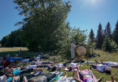 Po Powitaniach Słońca przyszedł czas na zasłużony relaks - koncert Gongów i mis Tybetańskich w wykonaniu Adama Lisa na szycie góry.
