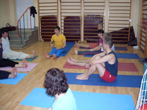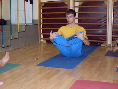 Nieco łatwiej poszło z praktyką oddechu ujjayi. Radek bardzo dokładnie wytłumaczył, jak to należy robić i zaczęliśmy oddychać. Słuchający oddechów Radek nas pochwalił.
