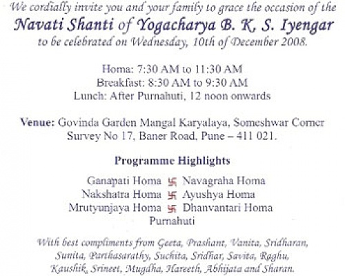 Przypominamy, że Polskie Stowarzyszenie Jogi według metody Iyengara zachęca do zorganizowania specjalnych, odpłatnych dwugodzinnych sesji jogi (np.o 18:00) w całej Polsce w dniu urodzin Gurujiego, tj. 14 grudnia 2008 roku.
