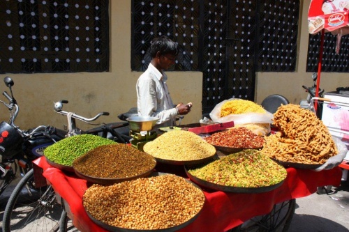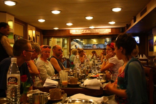 W końcu grupa podjeżdża, siadamy przy długaśnym stole jak na weselu. I czekamy… Okazuje się, że hotel nie jest gotowy na tak dużą grupę, przychodzi sam szef szefów i prosi o wyrozumiałość, przez dużą szybę widzimy uwijających się w kuchni kucharzy. Ekipa powiększa się w końcu dostajemy przystawki z pieca tadoori, są super. Część grupy na drugim końcu stołu nie orientuje się, że to tylko przystawki. Z czasem wjeżdżają kolejne dania: różne odmiany paneera, kaszmiri Alu- faszerowane smakołykami ziemniaki, dahl i do wyboru różne rodzaje nanów, roti etc. Jedzenia jest za opór - nie jesteśmy w stanie podołać. Po obiedzie woda z cytrynką - do umycia rąk - słodycze. Słodycze mogłyby być lepsze. Wytaczamy się z restauracji i na piechotę wracamy do hotelu.