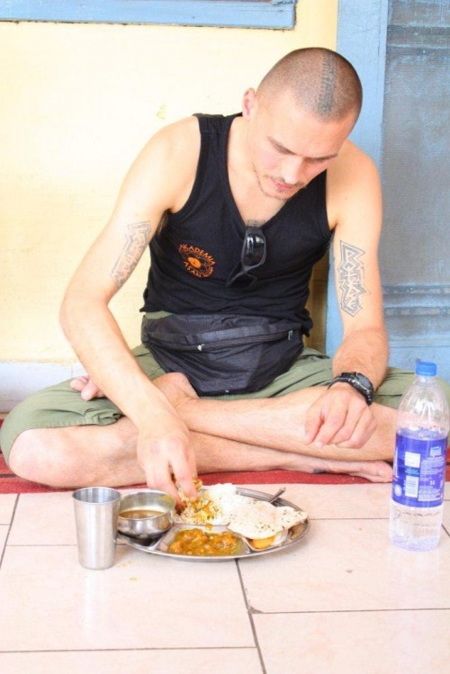 Justa poprowadziła pierwsze zajęcia. Potem luncho-śniadanie w Asharmowej jadłodajni. Jak w indyjskim więzieniu z filmu o vipassanie - siedzimy w rządku na podłodze na lichym dywaniku. Podchodzą pracownicy kuchni i z wiadra nakładają smakołyki. Uwielbiam to jedzenie - jest bardzo proste, nie pikantne ale super. Przed posiłkiem szef kuchcików odśpiewuje krótka, hinduską modlitwę.