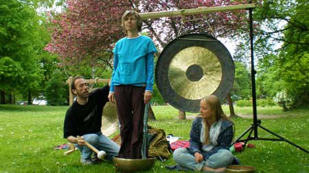 Po zajęciach Staszek Buła zagrał koncert gongów. Dźwięki gongów, mis w niezwykły sposób wibrowały w przestrzeni, komponowały się z szumem wiatru, śpiewem ptaków. Debiutancki koncert w naturze okazał się sukcesem.