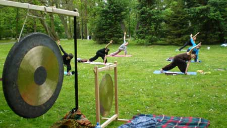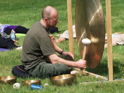 Po zajęciach ukoił nas dźwięk gongu i mis tybetańskich. Relaksowi towarzyszył śpiew ptaków i radosny śmiech bawiących się dzieci.