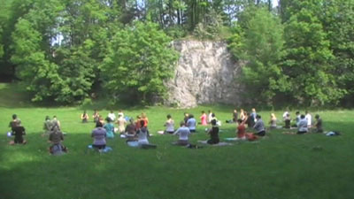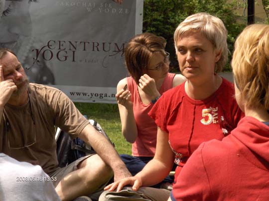 Rozpoczęliśmy kilka minut po 10.00, czekając na spóźnialskich - w sumie 20 osób. Okazało się, że 3/4 z nas miała lub ma kontakt z jogą. Tym razem zajęcia poprowadził Rafał Kozioł - dyplomowany instruktor wg metody B.K.S. Iyengara. Zapytał o problemy zdrowotne i ustawił nas w słońcu - świeciło jeszcze niezbyt mocno, za to wysuszyło już trawę z porannej rosy. Zaczęliśmy od tzw. siadu japońskiego i zaintonowaliśmy trzykrotnie głoskę OM. Inaczej, ciszej zabrzmiał głos ludzi na wolnym powietrzu, razem z ptakami i wiatrem. Potem rozgrzewka - pies z głową na dół powtórzony trzykrotnie i pozycje stojące. Rafał swoim spokojnym głosem prowadził grupę .
