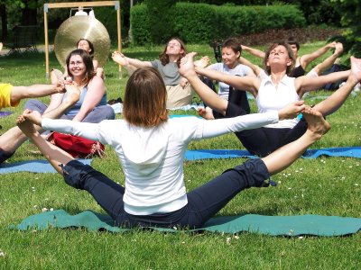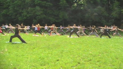 Tym razem na naszej soczyście zielonej trawie praktykowało około 100 osób!. Zajęcia poprowadziła Jola Paczyńska-Piasecka z Centrum Yogi.