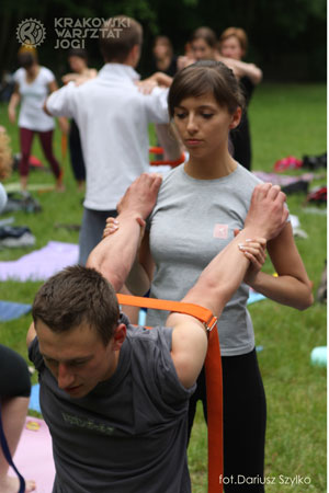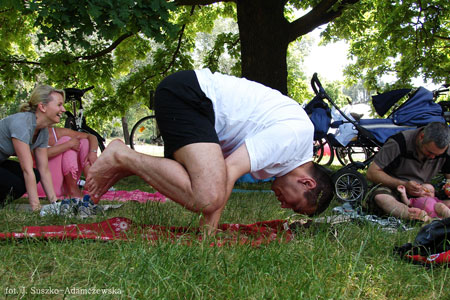 W zastępstwie za Adama Bielewicza zajęcia prowadził Przemek Nadolny, z Joga! Centrum. Dla niektórych nie była to łatwa sesja, (wygięcia do tyłu, balanse, skręty z padmasaną) ale pokazała całe spectrum pozycji jogi, których jest przecież bez liku.