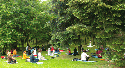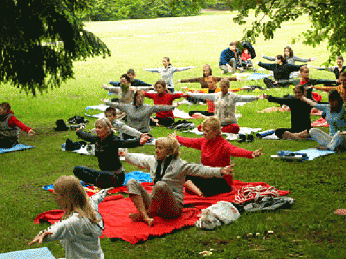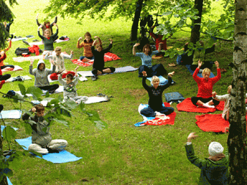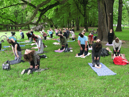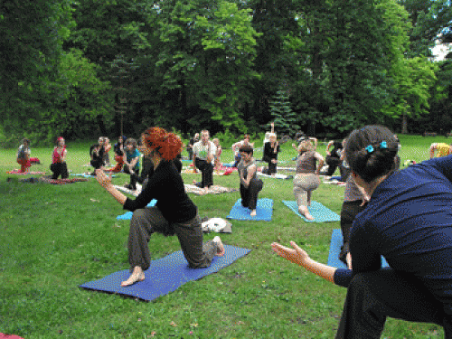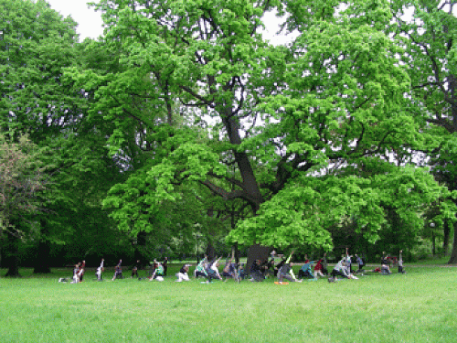 Łódź, Park ŹródliskaTego dnia po łódzkim niebie wiatr przepychał szybko ciężkie szare chmury. W chwilowym słonecznym oczku o 10.00 i w temperaturze ok. 11oC rozpoczęliśmy praktykę jogi na trawie w grupie 36 osób. Słońce jednak z nas zażartowało i szybko schowało się za chmury, z których zaczął kapać deszcz. Schroniliśmy się pod pięknym dębem jak pod olbrzymim parasolem. Praktyka obejmowała asany z grup stojących, delikatnych wygięć do tyłu, skrętów i skłonów w siadach, dla bardziej zaawansowanych także w pozycji pełnego lotosu. Krótkie czasy trwania, częste zmiany stron i wplecione pomiędzy asany cykle surya namaskar pozwoliły utrzymać ciała w cieple. Sesję zakończyliśmy 5-minutową śavasaną w ciszy, którą stworzyła dla nas sama przyroda oraz trzykrotnym wspólnym "OM".