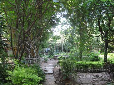 Miejsce przeurocze. W środku, bardzo ruchliwej części miasta, oaza spokoju. Główny budynek to parterowy pawilon, o symetrycznym, dwukrotnie złamanym kształcie, tak, że jedna strona pozostaje otwarta. W środku i poza obrębem budynku ogród. Ze wszystkich pokoi roztacza się widok na umieszczoną w centrum fontannę, zamieszkałą przez ponad sto, wielkości dużej płotki - czerwonych i białych nakrapianych na czerwono - ryb oraz jednego żółwia, który czasami wystawia głowę ponad lustro wody. Wzdłuż alejek poustawiane ceramiczne, ręcznej roboty, donice. W nich krzewy, małe drzewka i kwiaty. Podobne spotkać można w naszych domach. Te tutaj często w wydaniu, nie dość, że bujniejszym to i gabarytowo większym. W cenie wynajmu pokoju trzy posiłki i herbata z dwoma herbatnikami. Cena za dobę, w przeliczeniu na złotówki - niecałe 20 zł. Przeprowadzam się z początkiem miesiąca.