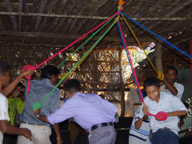 Okazało się, że na Goa Holi ma inną nazwę - Shimgo i obchodzone jest trochę inaczej. Właściwie każdy region Indii posiada specyficzną nazwę dla Holi, towarzyszą mu również odmienne rytuały. Na Goa Shimgo zaczęto obchodzić już kilka dni wcześniej, trudno było znaleźć otwarte biuro, wypożyczyć łódkę, złapać rikszę lub taksówkę. Zamiast zarobku pracownicy wybrali uczestnictwo w świątecznych obchodach. Wszystko wydawało się owiane jakąś pradawną tajemnicą, niedostępne i niezrozumiałe dla turystów. Od domu do domu, niczym kolędnicy wędrowały grupki mężczyzn, towarzyszył im śpiew i przenikliwe dudnienie bębnów. Któregoś dnia zahipnotyzowani niezwykłą ludową muzyką, wtopiliśmy się w kolorowy tłum mężczyzn i ruszyliśmy za nimi do jednej z wiejskich chat. Gospodarz domu szybko wyłowił nasze blade twarze spośród tłumu i zaproponował honorowe miejsca na ogrodowych krzesełkach, tuż obok małego ołtarzyka. Przed naszymi oczami roztoczył się piękny spektakl kolorów, który przywołał wspomnienie naszych skansenów i dawnych pięknych tradycji ludowych. Na stropie zadaszenia zawisł gruby splot kolorowych sznurów, następnie do każdego sznurka został przyporządkowany jeden chłopiec. Już po chwili w rytmie bębnów zaczęli synchronicznie przemieszczać się z kolorowymi sznurkami, według jakiejś zaszyfrowanej, tylko im znanej zasady. Bębniarze grali coraz głośniej, coraz szybciej a wraz z nimi powolne ruchy chłopców przemieniły się w energiczny taniec. Jedno spojrzenie w górę upewniło mnie w tym, że ruch ten był niezwykle przemyślany - ponad ich głowami zawiązał się piękny kolorowy warkocz. Wszyscy na chwilę zamilkli - by na nowo oddać się muzyce i odpłynąć w kolejnym kolorowym tańcu.