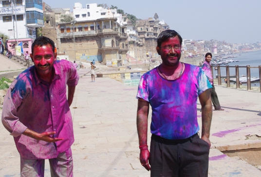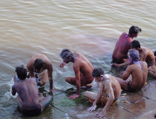 I tak oto zostałam pozbawiona przyjemności świętowania Holi. Z perspektywy czasu, kobietom, które chcą czynnie uczestniczyć w festiwalu kolorów, polecam duże miasta: New Delhi Mumbai lub hippisowski Puszkar. Tym, którym wystarczy bierna partycypacja, polecam aby wcześniej zarezerwowały pokój z widokiem na jeden z głównych placów, gdzie zbierają się ludzie, lub by usadowiły się na dachu pobliskiej restauracji. Holi staje się bezpieczne dopiero po południu, wtedy część osób udaje się na drzemkę a inni idą się myć… a właściwie szorować. Po południu brzegi Gangesu mieniły się we wszystkich kolorach tęczy.