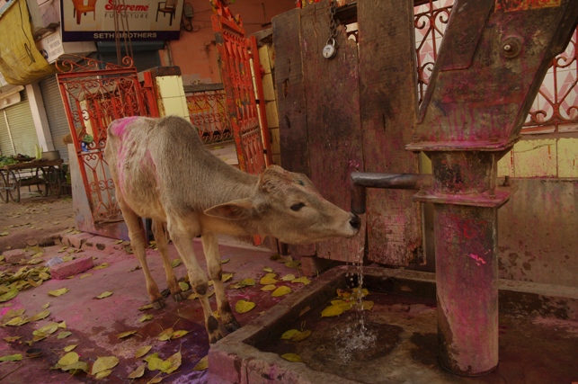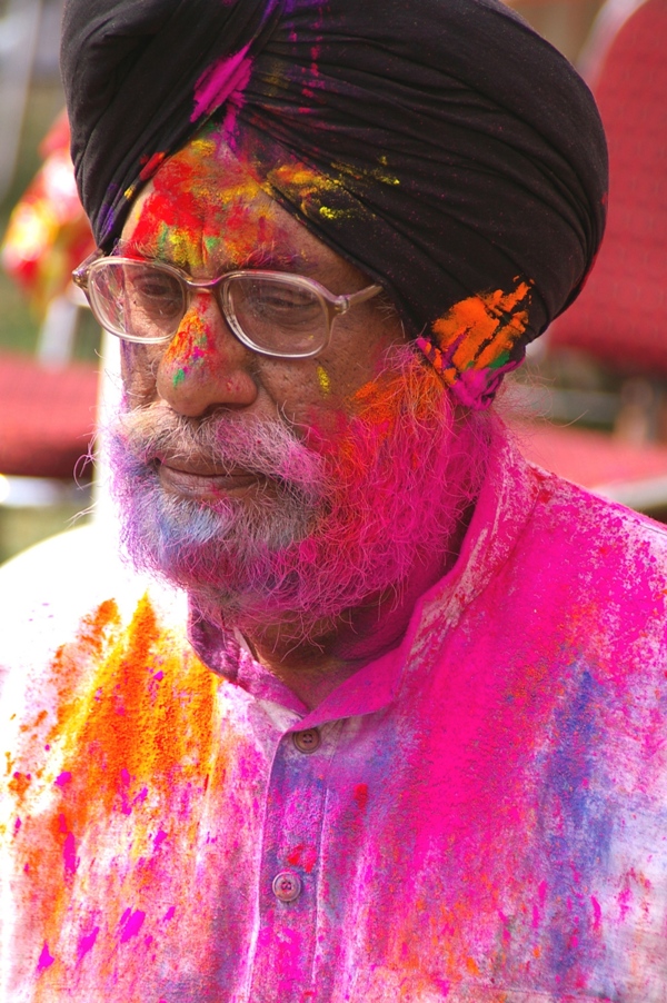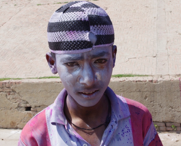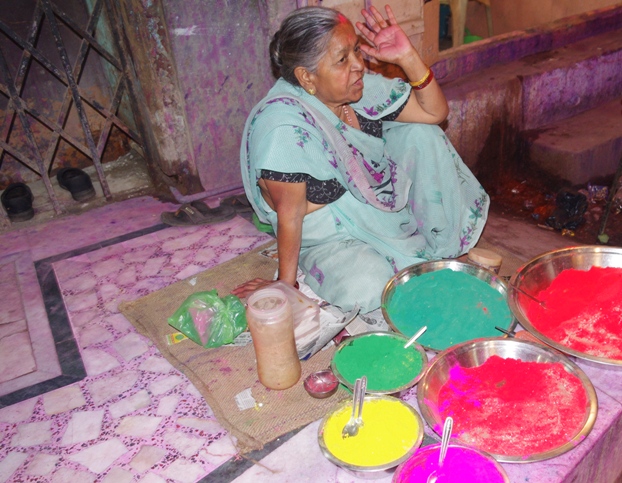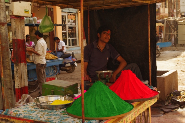Trafiliśmy na kluczowy moment Holi, w tamtym roku przypadało w poniedziałek, tak jak u nas Śmigus Dyngus. Jednak nasz Lany Poniedziałek nie jest obchodzony tak entuzjastycznie, jest bezbarwny i przeznaczony głównie dla dzieci. Indyjski Dyngus obfitował w kolory i różne formy ekspresji: baloniki z kolorową wodą zrzucane z dachów, pistolety z kolorowym płynem, wiadra wody wylewane prosto na głowę… Jednak zanim to nastąpi - wysmarowanie ciała kolorowym proszkiem, który zmieszany z wodą wnika głęboko w skórę. Uliczne stragany zachęcają przechodniów kopczykami proszków (gulal i abeer) we wszystkich kolorach tęczy. Wszyscy dzielą się nimi jak opłatkiem lub wielkanocnym jajkiem a potem życzą sobie wesołych świąt. Rozpoczynają się walki na kolory, którym towarzyszą niezwykle głośne pochody bębniarzy, lub znane kawałki Bollywoodu, rozsyłane w przestrzeń przez olbrzymie głośniki. Wokół nich gromadzą się kolorowe tłumy, w somnambulicznym tańcu zażywające kolorowej kąpieli pośród wirującego wraz z nimi wielobarwnego pyłu. Dodatkowo w Holi uczestniczą wszyscy, bez względu na wiek, niestety trochę bardziej skomplikowana jest kwestia płci, ale o tym później.