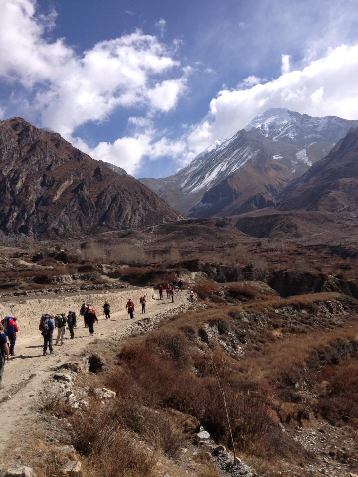 Nasza 20 - osobową grupą opiekuje się dwóch nepalskich przewodników - Hum i Prim. Na przekor nazwie Prim zabezpiecza tyły, a Hum idzie przeważnie z przodu dyktując tempo i kierunek marszu.Kolejne trzy dni, były spokojną wędrówką w kierunku miejscowości Largung, Ghasa, Totopani. Krajobraz zmienił się całkowicie, pojawiła się zieleń, sady jabłoniowe, lasy iglaste, klimat stal się łagodniejszy. Bielące się za naszymi plecami szczyty gór przypominały nam o surowych warunkach, jakie spotkały nas na wysokości 4000 mnpm. Zza kolejnych zakrętów wyłaniały się dumne szczyty kolejnych pasm górskich, w takich okolicznościach przyrody praktyka asan zyskała nowy wymiar. Co prawda, niewiele osób miało jeszcze ochotę podczas przerwy w marszu ćwiczyć jogę, jednak Ci, którzy ćwiczyli, zgodnie twierdzili, że było to niezapomniane przeżycie.