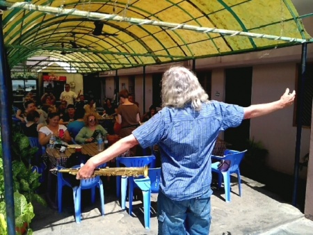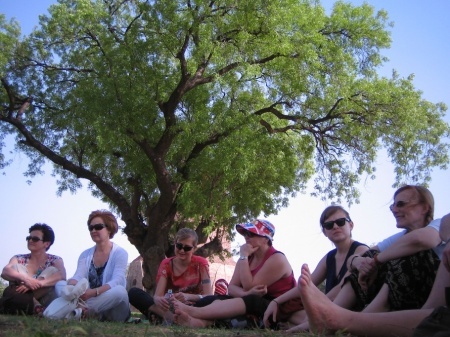 Pod jednym z ich spędzamy większość czasu, każdy z uczestników wyprawy mówi kilka słów o sobie- jest cicho, ciepły wiatr orzeźwia rozpraszając gorące powietrze. Miejsce jest spokojne i cicho jak nie w Indiach - aż się nie chce ruszać. Ale czas w drogę, posiłek w lokalnej restauracji chola batura - cieciorka i dwa w głębokim oleju smażone placki puri- tradycyjna hinduska przekąska. Wracamy do Benares, po drodze wizyta w "goverment aproved silk center" - komiczna jest ta oficjalna podbudowa, wiozą nas do hurtowni jedwabiu, gdzie nasz przewodnik zgarnie prowizję za zakupy. Z drugiej strony sprzedawane produkty nie są oszukane jak na straganach Varanasi. Na początek imponująca prezentacja starodawnych technik wytwarzania jedwabiu, robi wrażenie czasochłonność tych sposobów. Przy krosnach kilkoro staruszków. Potem super sprawne pokazanie produktów - są mistrzami sprzedaży. Część grupy zaopatruje się w rożne fatałaszki i powrót.