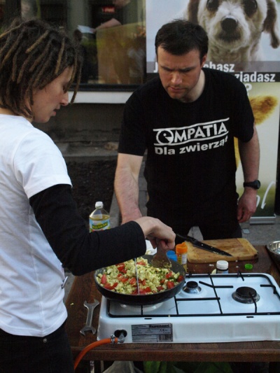 Odbywają się też pokazy gotowania, aby dać dowód jak smaczna i kolorowa może być dieta roślinna. Gościliśmy m.in. Jolę Słomę i Mirka Trymbulaka, którzy nie tylko świetnie gotują, ale także zajmująco o tym opowiadają. Nic dziwnego, że są również często zapraszani do telewizji jako świetni kucharze i autorzy książek na temat jedzenia. Na pokazy przychodzi bardzo dużo osób. Wychodzą zrelaksowani, z pomysłami na wegańskie potrawy.