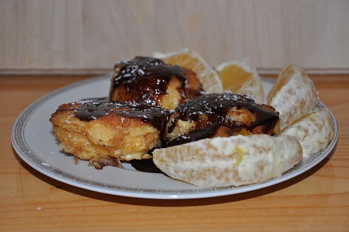 Mikołajki to słodki czas czekolady i pomarańczy. Jeśli do tego masz pod ręką puszkę brzoskwiń, wiórki kokosowe i cynamon, możesz wyczarować sobie i bliskim smakowity deser za znakomity ma jesienno-zimowy podwieczorek. Smacznego! :-)
