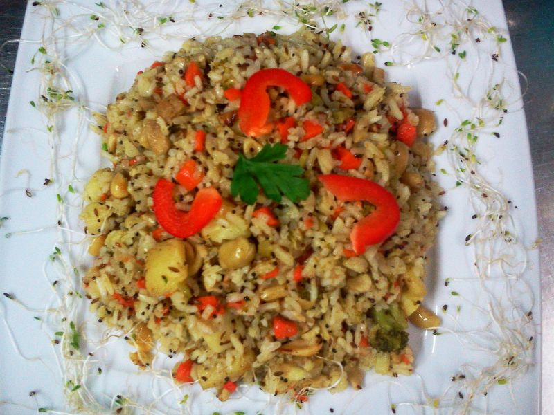 Pulao to sypki ryż z warzywami. Można użyć każdego rodzaju ryżu, każdego gatunku orzechów (albo nie dodawać orzechów wcale). Dobrze jest użyć kolorowych warzyw - wtedy jest nie tylko smaczne ale i apetyczne. Tutaj proponujemy ekskluzywną wersję z ryżu jaśminowego i orzechów nerkowca.