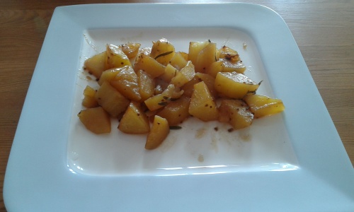 Naczynie wkładamy do piekarnika. Temperatura ok. 200-220 stopni. Pieczemy ok. 30 minut (czas zależy od rodzaju ziemniaków). Po 15 minutach można zajrzeć do piekarnika i zamieszać w naczyniu. Gdy ziemniaki będą już miękkie i przyrumienione - danie gotowe.