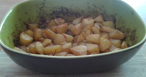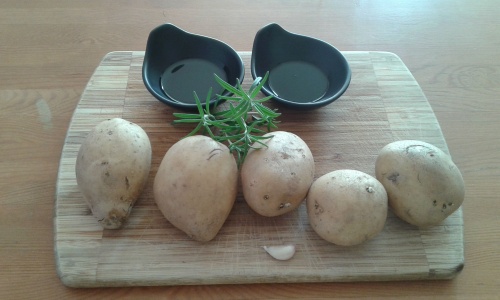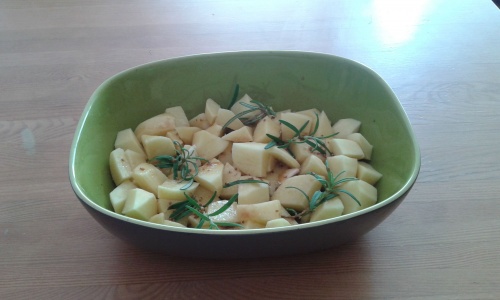 Ziemniaki obieramy, kroimy w dość dużą kostkę. Wkładamy do żaroodpornego naczynia. Najlepiej będzie, jeśli ziemniaki ciasno pokryją dno. Z oliwy, sosu sojowego i wody robimy sos, którym polewamy ziemniaki. Wrzucamy jeszcze kilka gałązek świeżych ziół, ząbek czosnku. Delikatnie mieszamy.