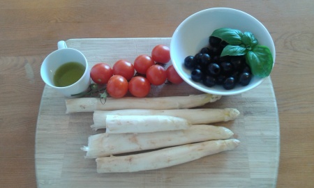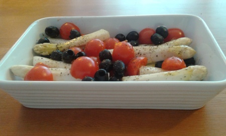 Pieczemy ok. pół godziny w temperaturze ok. 180-200 stopni. Szparagi powinny być lekko jędrne. Można posolić po upieczeniu, ale uważajmy z tą przyprawą, bowiem oliwki są same w sobie słone.
