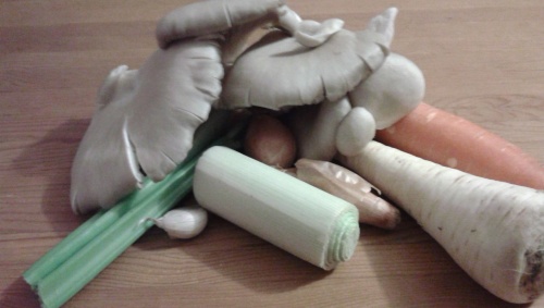 Do przygotowania zupy potrzebujemy: pół kilograma boczniaków, dwie szalotki, ząbek czosnku, kawałek pora (biała część), średnią marchewkę, dwie łodygi selera naciowego, średni korzeń pietruszki, łyżkę majeranku, pół łyżeczki wędzonej papryki, pięć łyżek oleju rzepakowego, sos sojowy, pół łyżeczki startej na świeżo gałki muszkatołowej, dwa liście laurowe, kilka ziaren ziela angielskiego, sól, 1,5 litra wody.