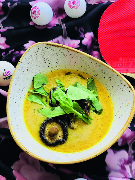 Cebule obieramy, kroimy w kostkę i smażymy na oliwie. Do garnka wlewamy mleczko kokosowe i wodę. Dodajemy pastę curry, grzyby, trawę cytrynową i kaffir i gotujemy. Po 10 minutach wyciągamy liście i trawę. Dokładamy podsmażoną cebulę, groszek, sok z limonki i przyprawy. Gotujemy jeszcze 5 minut. Curry podajemy z grzybami, udekorowane liśćmi szpinaku.