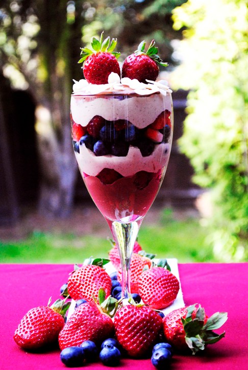Do tego przepisu zostały wykorzystane truskawki, maliny, borówki amerykańskie oraz płatki migdałowe ale możesz użyć każdych sezonowych owoców i orzechów.