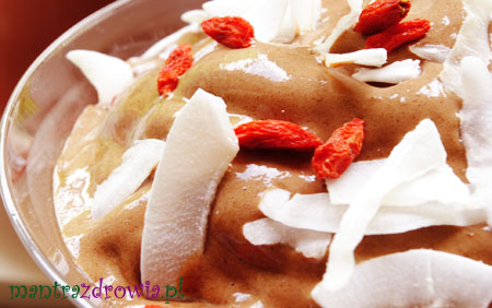 Wlej mleko migdałowe do blendera dodaj maca, cynamon, karob miksuj przez chwilę następnie dodaj banany, dla ozdoby dodaj wiórki kokosowe, jagody goji lub suszone owoce.