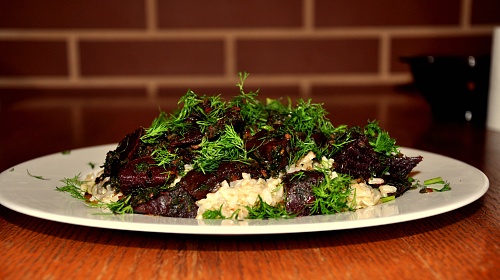 Ugotowane i jeszcze ciepłe buraki pokrój w ćwiartki. Na patelni podsmaż posiekaną cebulę i słonecznik, dodaj kawałki buraków, rozdrobniony czosnek, przypraw i duś pod przykryciem około 10 min. W międzyczasie ugotuj ryż a potem połącz go z zawartością patelni. Na talerzu udekoruj dużą ilością posiekanej natki pietruszki i kopru.