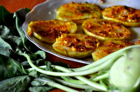 Obraną z liści kalarepkę ugotuj do miękkości (około 15-20 min.). Ugotowaną i przestygniętą kalarepę pokrój w grube plastry, natrzyj posiekanym czosnkiem, otocz w siemieniu lnianym, przypraw i delikatnie podsmaż z obydwu stron na rozgrzanej patelni. Podawaj np. z kaszą jaglaną, ryżem, ziemniakami lub w bułce jako dodatek do wegeburgera.