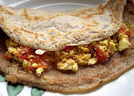 Na rozgrzaną patelnię wrzucamy rozdrobnione tofu, dodajemy zmiażdżony ząbek czosnku, pieprz, curry, sól, pokrojone drobno pomidory, bazylię, kurkumę i tymianek i dusimy pod przykryciem. Pod koniec gotowania dodajemy rozkruszony ser pleśniowy.