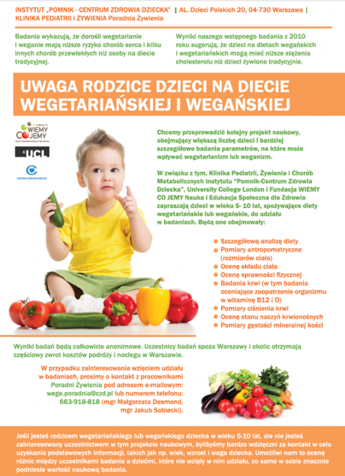 To obszerne badanie naukowe poświęcone wpływowi diety na czynniki ryzyka chorób krążenia u dzieci. Jest to projekt badawczy Instytutu "Pomnik - Centrum Zdrowia Dziecka", University College London oraz Fundacji WIEMY CO JEMY Nauka i Edukacja Społeczna dla Zdrowia. Do udziału w badaniu mogą zgłosić się dzieci w wieku 5-10 lat, na dietach wegetariańskich lub wegańskich. Dzieci te będą mogły zaprosić do badania swoich rówieśników odżywiających się w sposób tradycyjny.