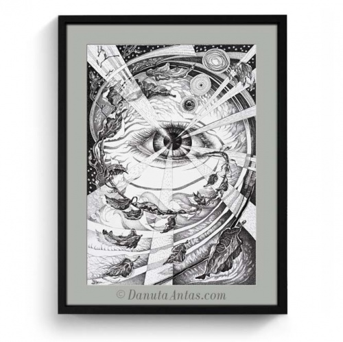 D.A.: Dla każdego artysty i dla mnie również, sztuka jest formą wypowiedzi myśli i przeżyć. Tak się składa, że zwykle to te najtrudniejsze w życiu przeżycia dotykają najbardziej czułych stron i wydobywają z człowieka nieznane pokłady kreatywności. W moim przypadku też tak było. Prace rysunkowe, o które Pani pyta, powstały między. 2002-2006 rokiem. W moim życiu był to najtrudniejszy okres, straciłam dwie bardzo bliskie osoby - mojego ojca i mojego męża. Obaj, zanim odeszli, ciężko chorowali. W tym też czasie odbywałam bardzo trudne i absorbujące studia z filologii angielskiej, do tego dom, praca, dziecko. Rzeczywistość mnie przerosła. Kiedy przysłowiowy kurz opadł po tej zawierusze, pozostała pustka, zagubienie, czasami rozpacz, ale i nadzieja. Wtedy zaczęły pojawiać się obrazy, które notowałam moim ulubionym ołówkiem automatycznym, tak bezwiednie, bez wcześniejszego zamysłu. Wszystko krążyło wokół wiary, Boga, życia po drugiej stronie oraz wokół ludzkich dramatów. Ożył temat "Stworzenia Świata" interesujący mnie od bardzo dawna. Praca poniżej, to "Tchnienie Boga", oddech ożywiający dopiero co stworzoną planetę Ziemię.
